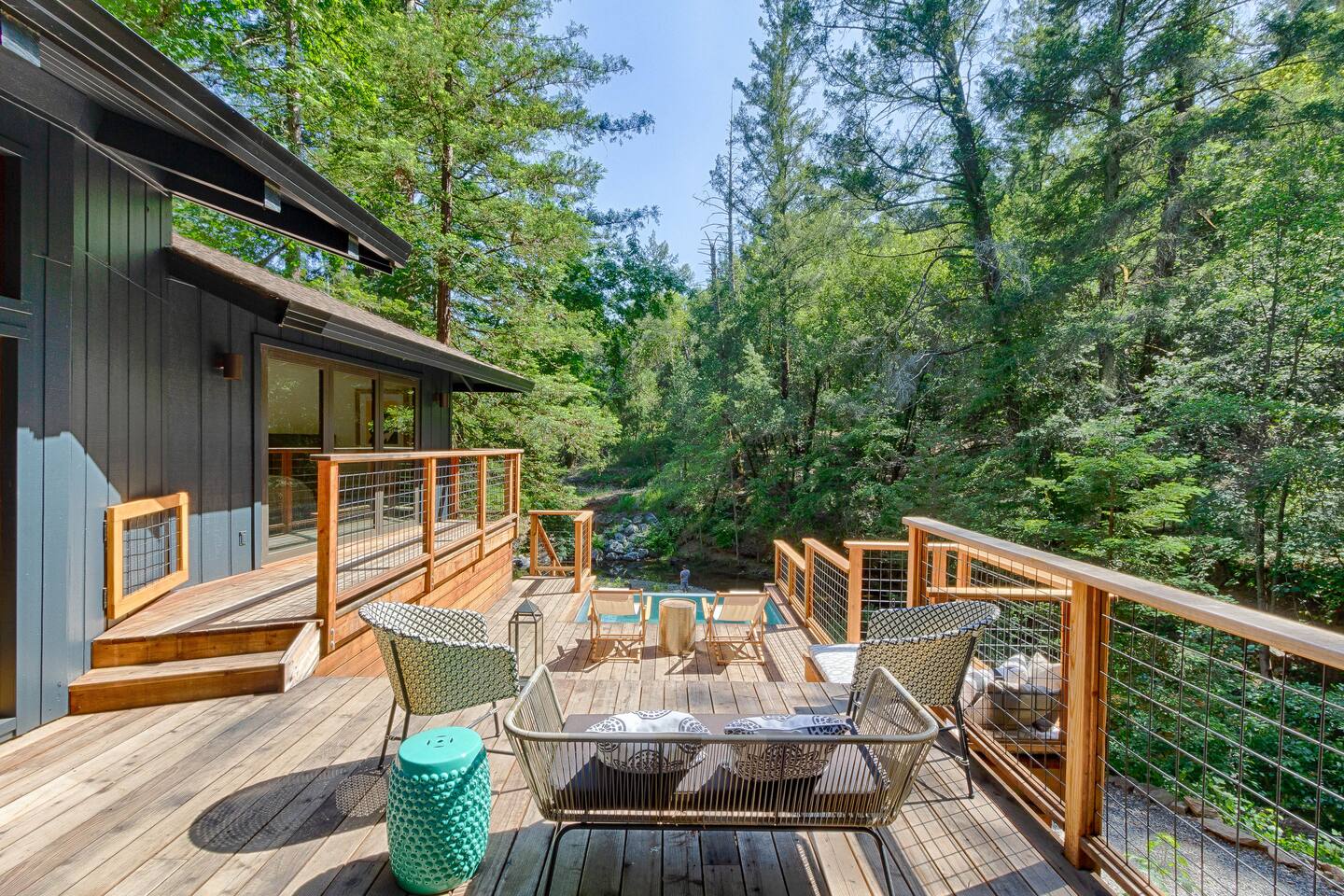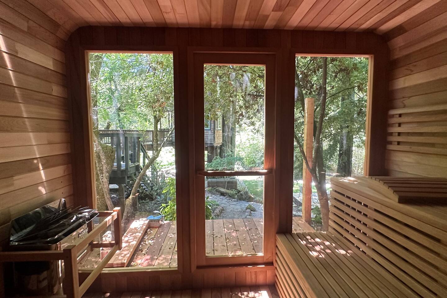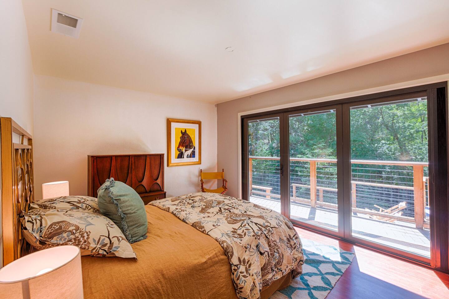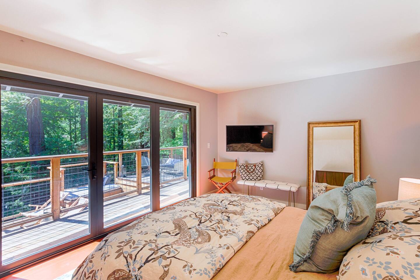 This cabin in the redwood grove sits right along Mill Creek, which feeds the Russian River and runs year round. Between May and September the creek is wonderful way to stay cool, and there is a swimming hole on the creek steps from the house. We love the contrasting colors of the sky and the green of the redwoods - during the day the sky is the bluest of blue, and at night the stars are right at your fingertips with no light pollution at all. We designed the day bed on the deck because we spent the summer we were renovating the house sleeping outside under the stars on a futon - you can do the same on the daybed if you choose. We love the Healdsburg area with access to world-class cycling, wine-tasting, culinary delights and more. Inside the house in the redwood paneled living room you can settle in with a glass of wine and listen to records on the vintage Marantz stereo and record player (careful please). 1000s of records means there will be somethng you love to listen to! We feel so unplugged when we visit this part of the world, and though wifi is available, the best screen time is outside staring at the redwoods and watching the birds and ducks in the creek. But if you need some wifi, ours is super fast - we just installed dedicated fiber. Main House: - 1 master bedroom w. king bed and ensuite full bathroom - 1 kids room with crib & daybed and ensuite full bathroom Bure (Detached Guest House): - Studio suite with queen bed and ensuite bathroom & outdoor shower We also offer a Peloton, Weights, and a Pilates Reformer. We hope you'll enjoy our home as much as we do.
