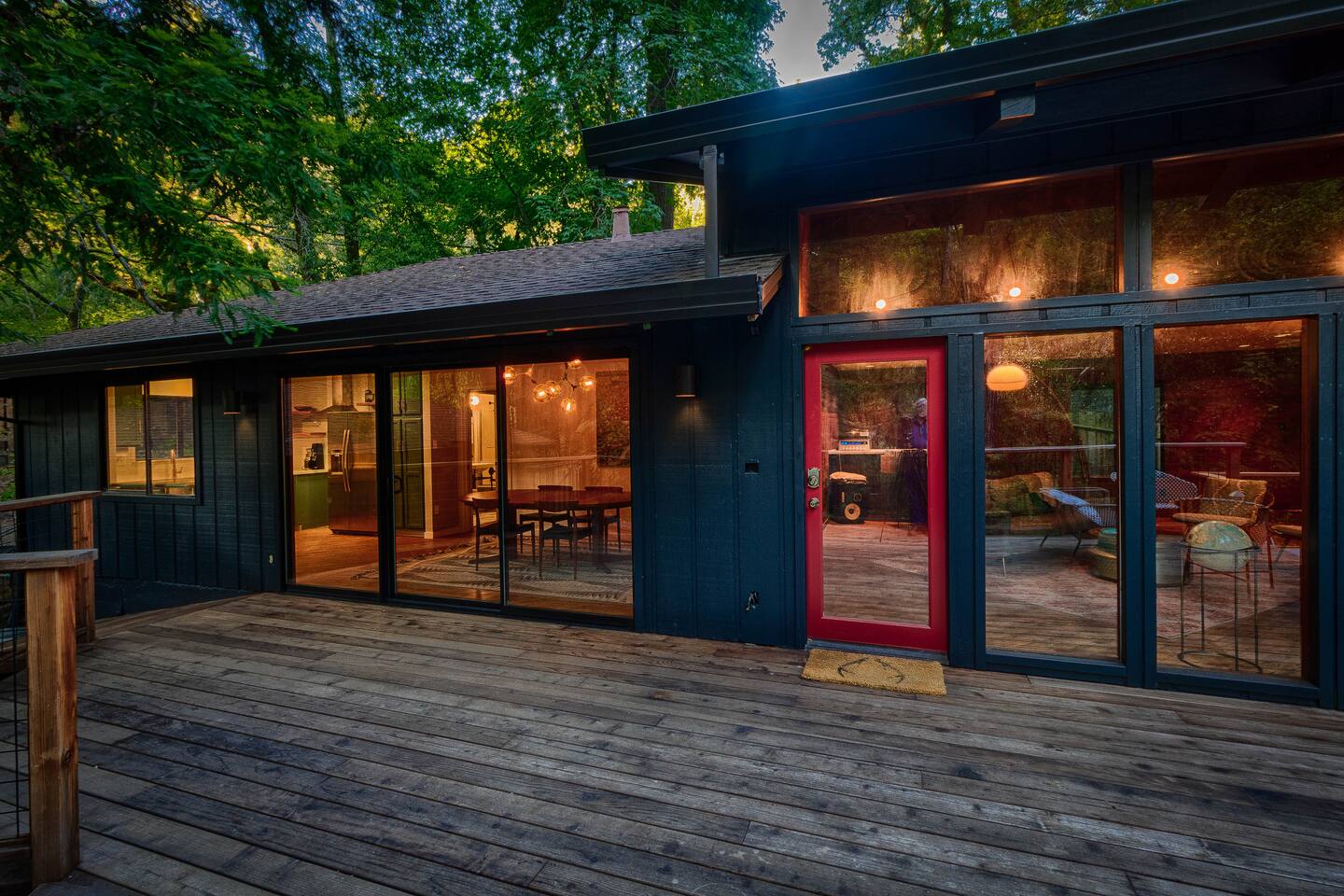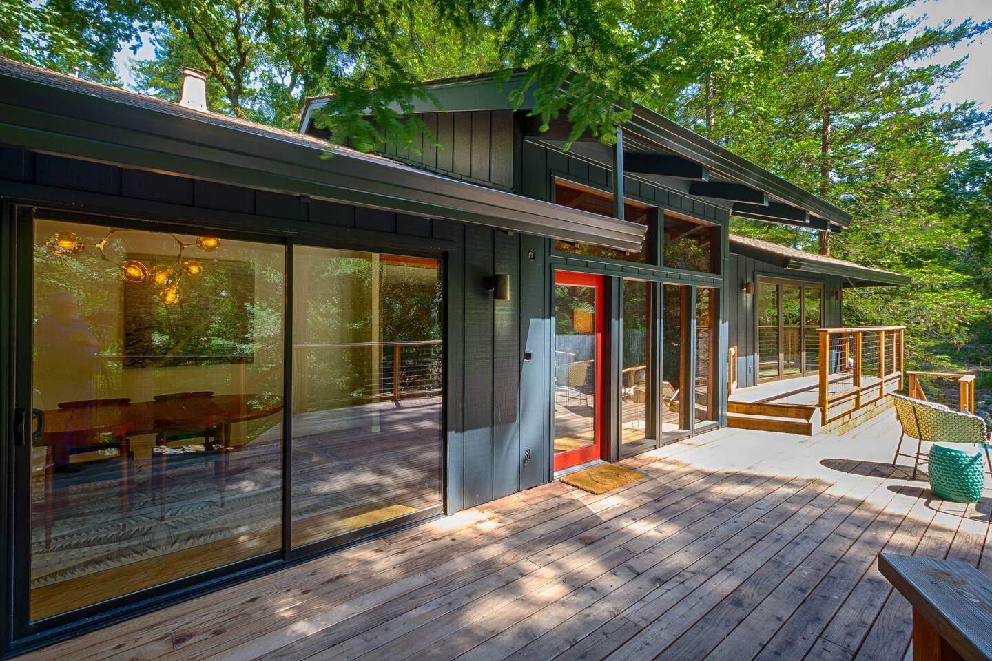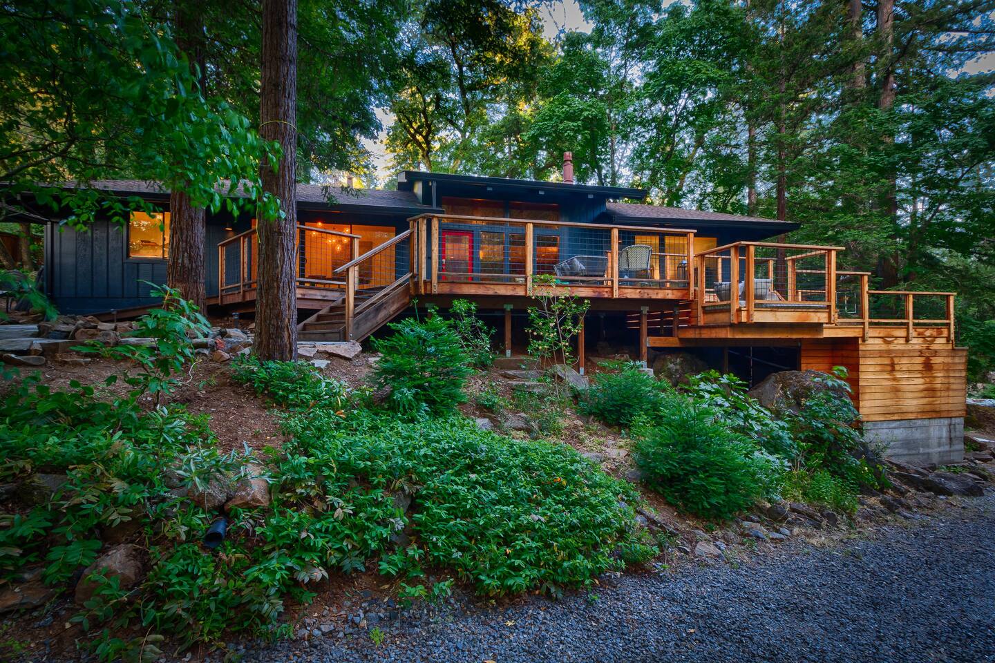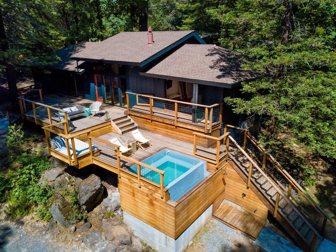 This cabin in the redwood grove sits right along Mill Creek, which feeds the Russian River and runs year round. Between May and September the creek is wonderful way to stay cool, and there is a swimming hole on the creek steps from the house. We love the contrasting colors of the sky and the green of the redwoods - during the day the sky is the bluest of blue, and at night the stars are right at your fingertips with no light pollution at all. We designed the day bed on the deck because we spent the summer we were renovating the house sleeping outside under the stars on a futon - you can do the same on the daybed if you choose. We love the Healdsburg area with access to world-class cycling, wine-tasting, culinary delights and more. Inside the house in the redwood paneled living room you can settle in with a glass of wine and listen to records on the vintage Marantz stereo and record player (careful please). 1000s of records means there will be somethng you love to listen to! We feel so unplugged when we visit this part of the world, and though wifi is available, the best screen time is outside staring at the redwoods and watching the birds and ducks in the creek. But if you need some wifi, ours is super fast - we just installed dedicated fiber. Main House: - 1 master bedroom w. king bed and ensuite full bathroom - 1 kids room with crib & daybed and ensuite full bathroom Bure (Detached Guest House): - Studio suite with queen bed and ensuite bathroom & outdoor shower We also offer a Peloton, Weights, and a Pilates Reformer. We hope you'll enjoy our home as much as we do.