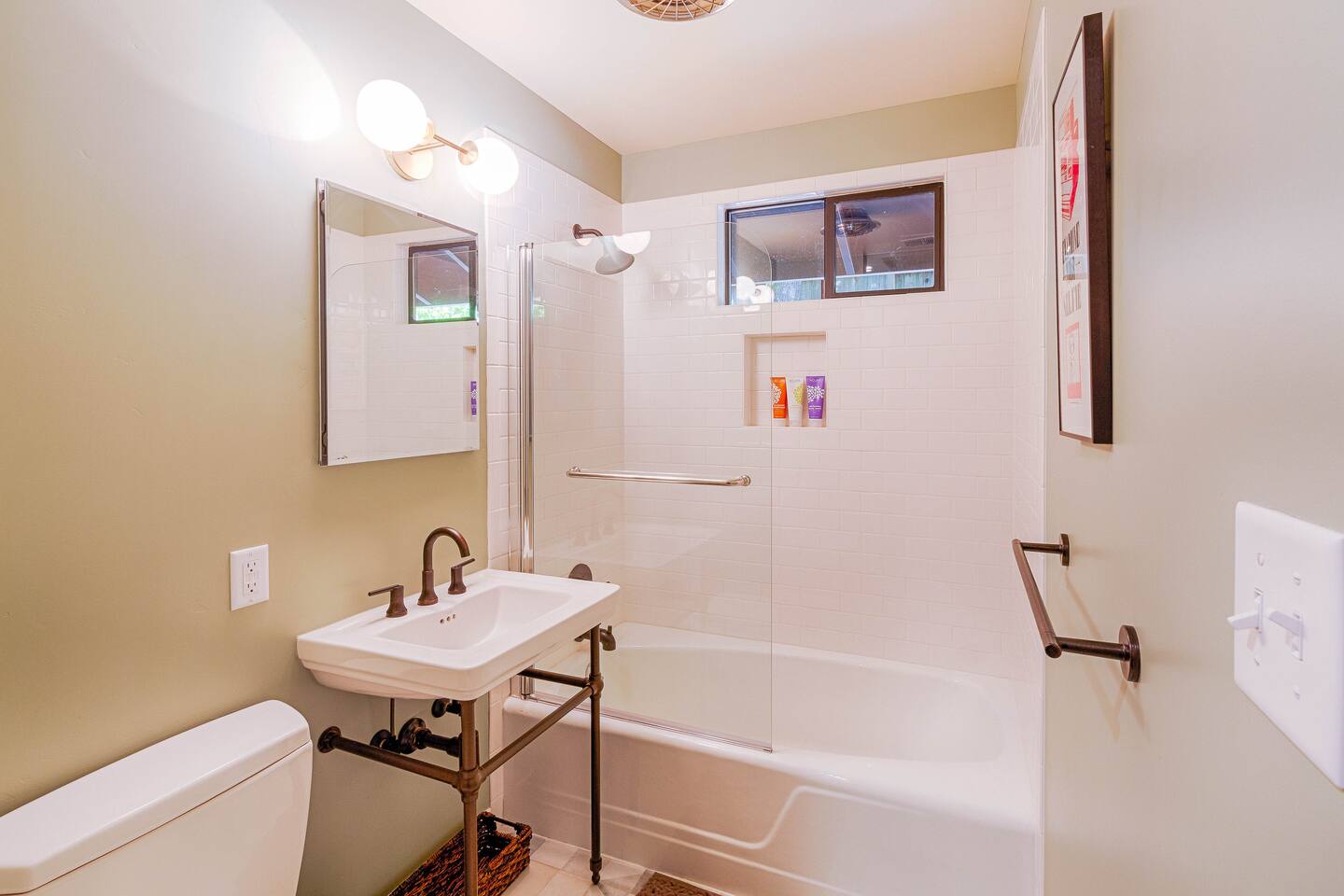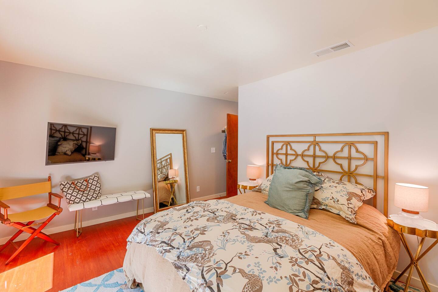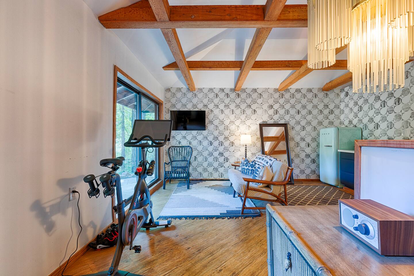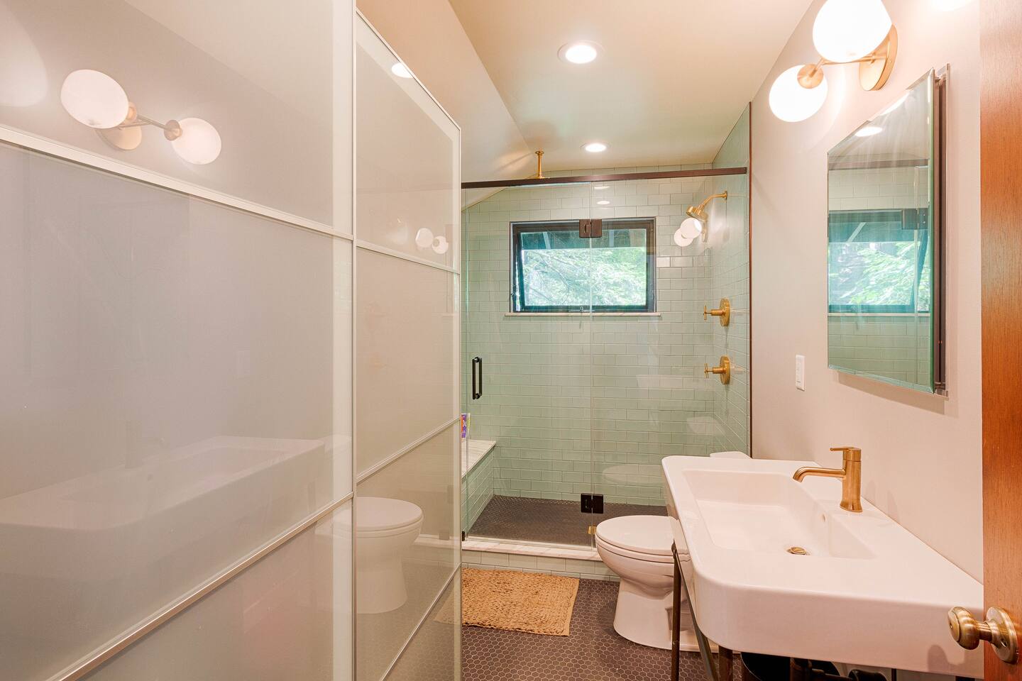 This cabin in the redwood grove sits right along Mill Creek, which feeds the Russian River and runs year round. Between May and September the creek is wonderful way to stay cool, and there is a swimming hole on the creek steps from the house. We love the contrasting colors of the sky and the green of the redwoods - during the day the sky is the bluest of blue, and at night the stars are right at your fingertips with no light pollution at all. We designed the day bed on the deck because we spent the summer we were renovating the house sleeping outside under the stars on a futon - you can do the same on the daybed if you choose. We love the Healdsburg area with access to world-class cycling, wine-tasting, culinary delights and more. Inside the house in the redwood paneled living room you can settle in with a glass of wine and listen to records on the vintage Marantz stereo and record player (careful please). 1000s of records means there will be somethng you love to listen to! We feel so unplugged when we visit this part of the world, and though wifi is available, the best screen time is outside staring at the redwoods and watching the birds and ducks in the creek. But if you need some wifi, ours is super fast - we just installed dedicated fiber. Main House: - 1 master bedroom w. king bed and ensuite full bathroom - 1 kids room with crib & daybed and ensuite full bathroom Bure (Detached Guest House): - Studio suite with queen bed and ensuite bathroom & outdoor shower We also offer a Peloton, Weights, and a Pilates Reformer. We hope you'll enjoy our home as much as we do.